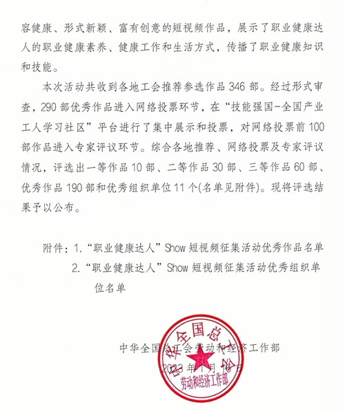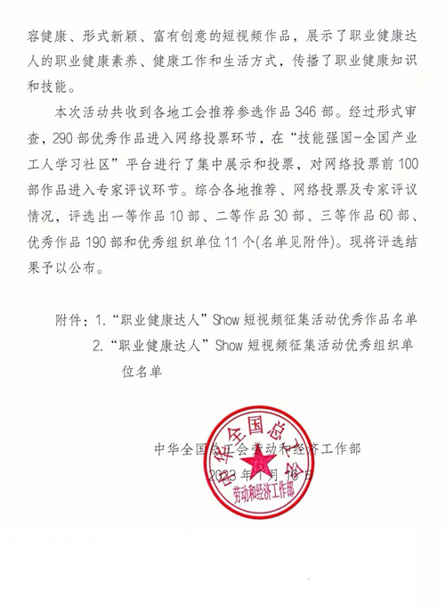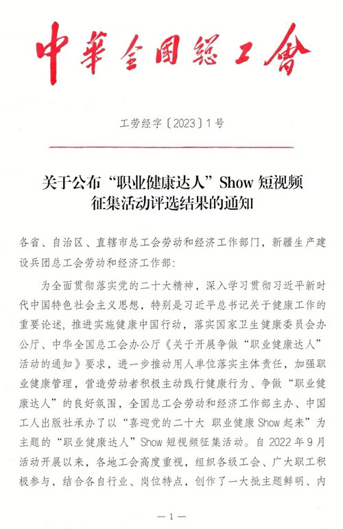 | 近日,全國(guó)總工會(huì)“喜迎黨的二十大 職業(yè)健康Show起來(lái)”為主題的“職業(yè)健康達(dá)人”Show短視頻征集活動(dòng)評(píng)選結(jié)果揭曉,咸陽(yáng)紡織集團(tuán)工會(huì)選送的作品《守護(hù)職業(yè)健康 爭(zhēng)做健康達(dá)人》榮獲三等作品。