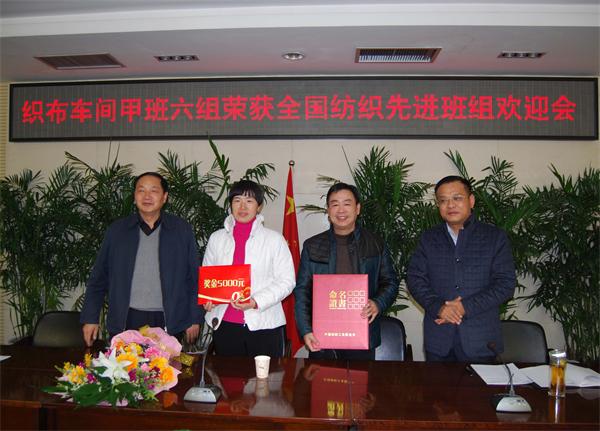 圖一:集團(tuán)公司領(lǐng)導(dǎo)向西北二棉織布車間甲班六組頒獎(jiǎng)